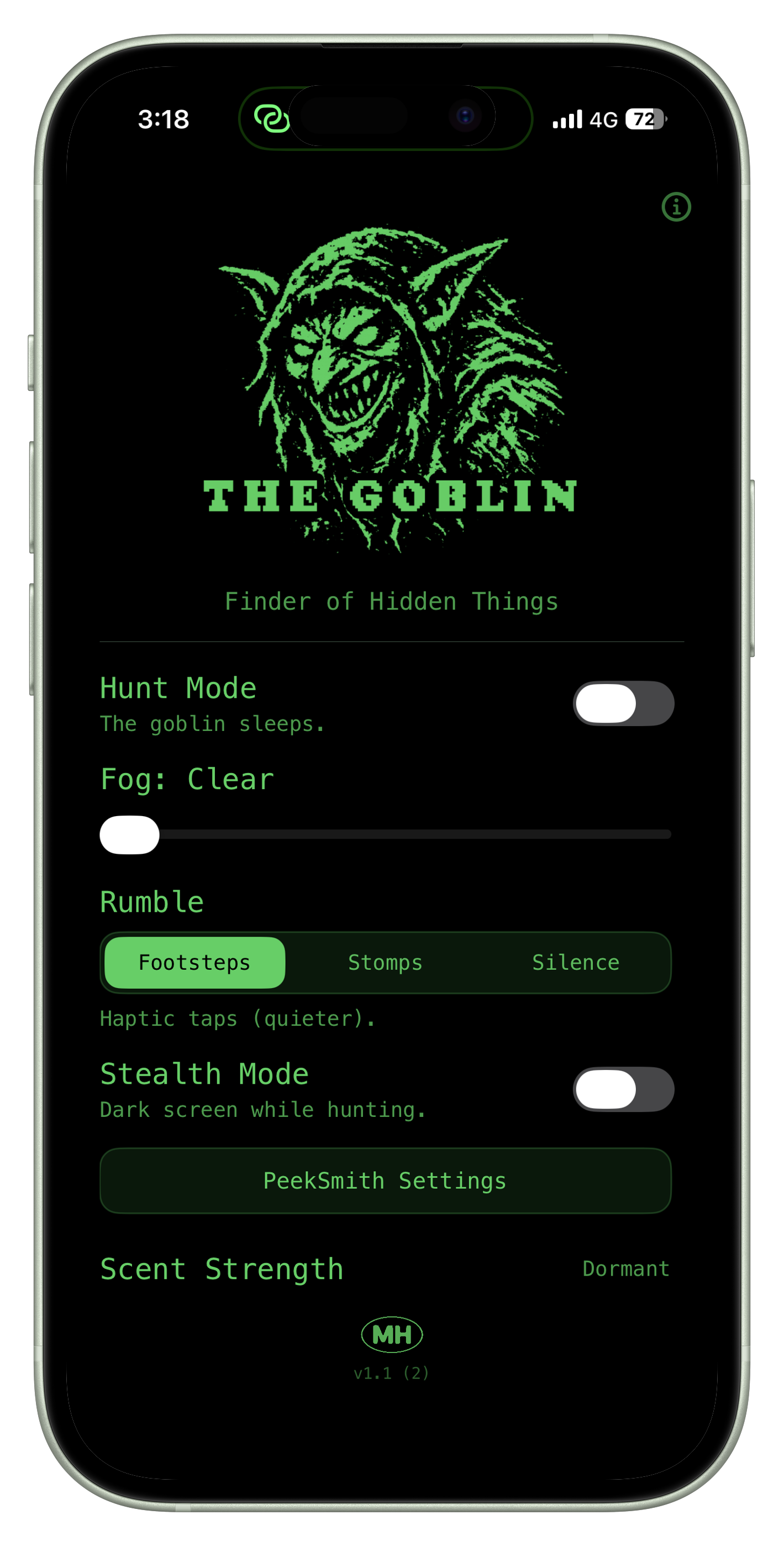 When using a PeekSmith device, The Goblin’s response can be set to silent, so that there’s no haptics or vibration. Instead, when The Goblin is triggered, your PeekSmith will notify you. PeekSmith vibration can also be enabled via the app, so if you cannot see your PeekSmith screen, you will still feel the response.